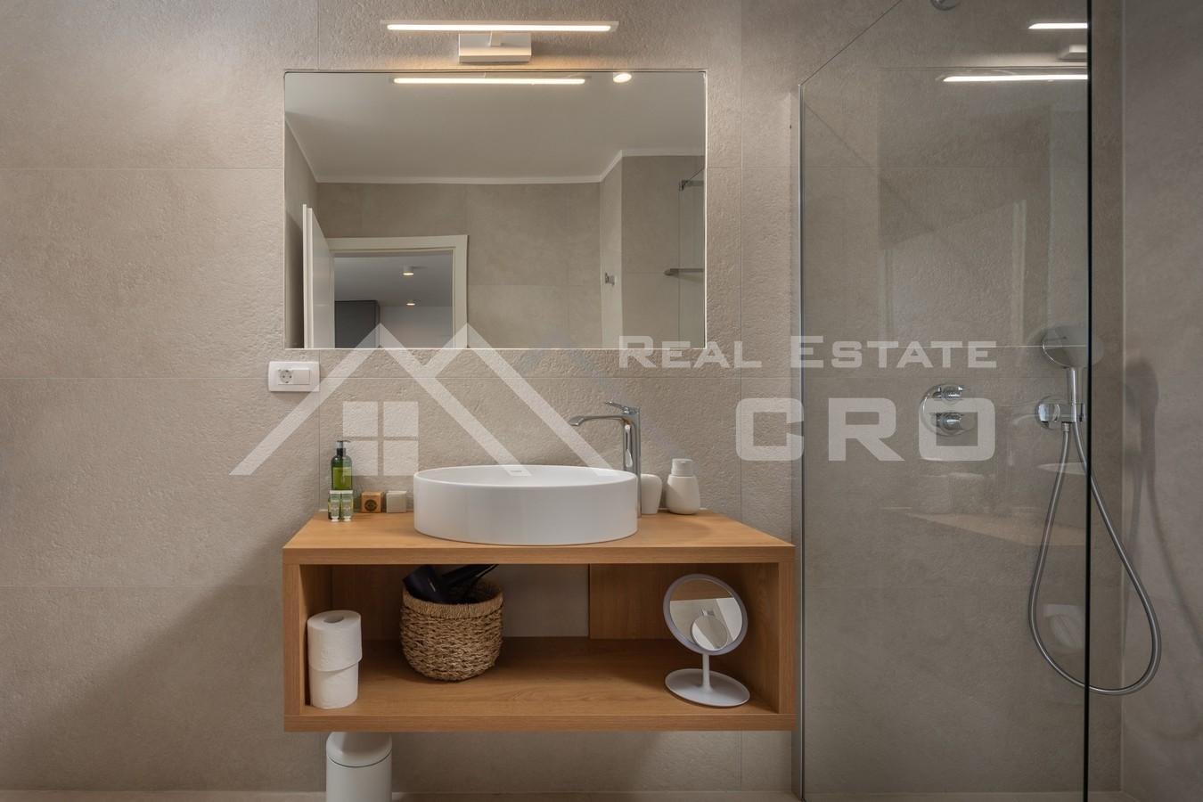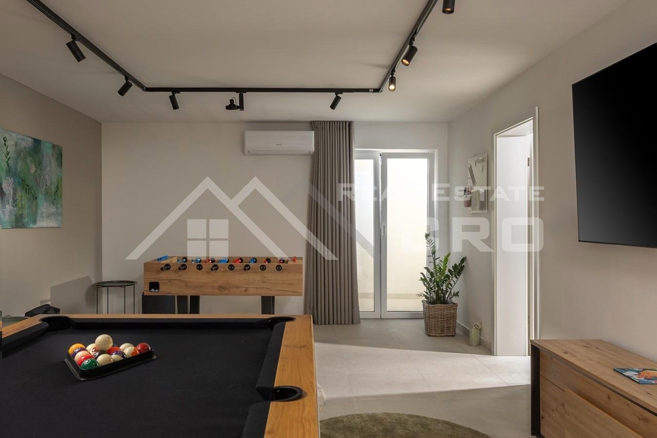 The total area of approx. 178 m2 is distributed over the ground floor and the first floor. The ground floor features an entrance hallway, storage room, toilet, one bedroom, and a spacious living room connected to a modern, fully equipped kitchen and dining area. On the same level, there is also an entertainment room equipped with darts, a billiard table, and table football. An internal staircase leads to the upper floor, where there are three bedrooms, each with its own en-suite bathroom. Two bedrooms have access to a spacious terrace of approx. 23 m2 with a beautiful sea view and views of the surrounding nature. The landscaped garden provides everything needed for relaxation during the warmer months: a swimming pool with a sunbathing area, an outdoor shower, and an outdoor dining area with a fireplace. Above the villa, there is private parking for three cars.