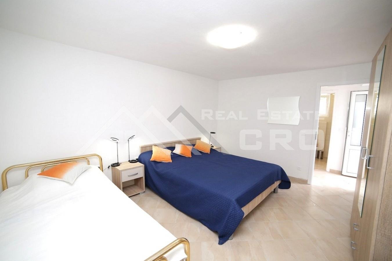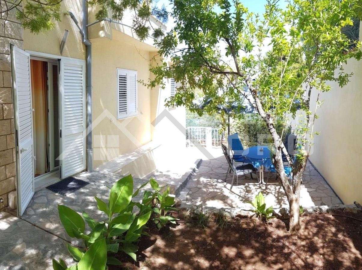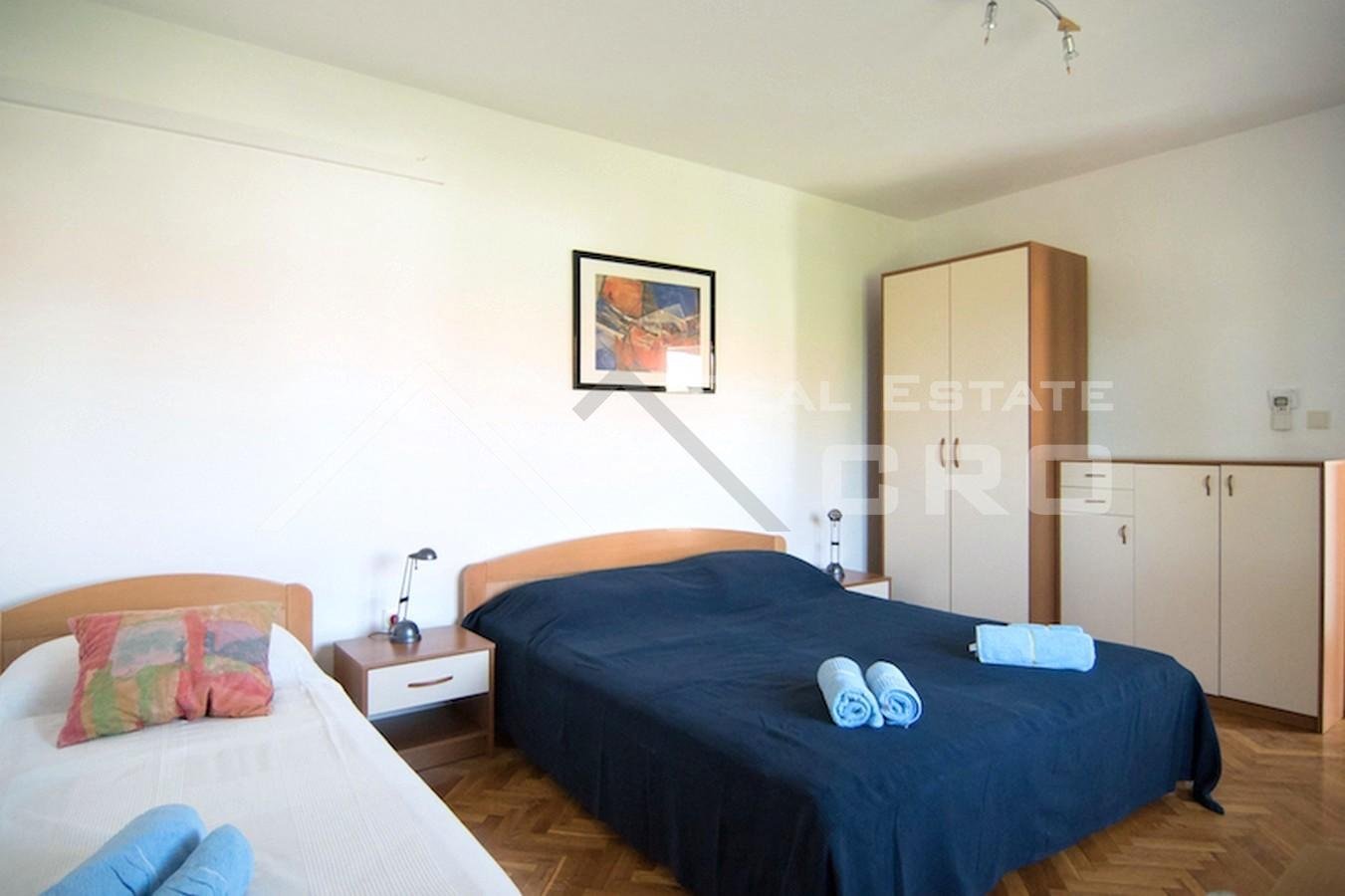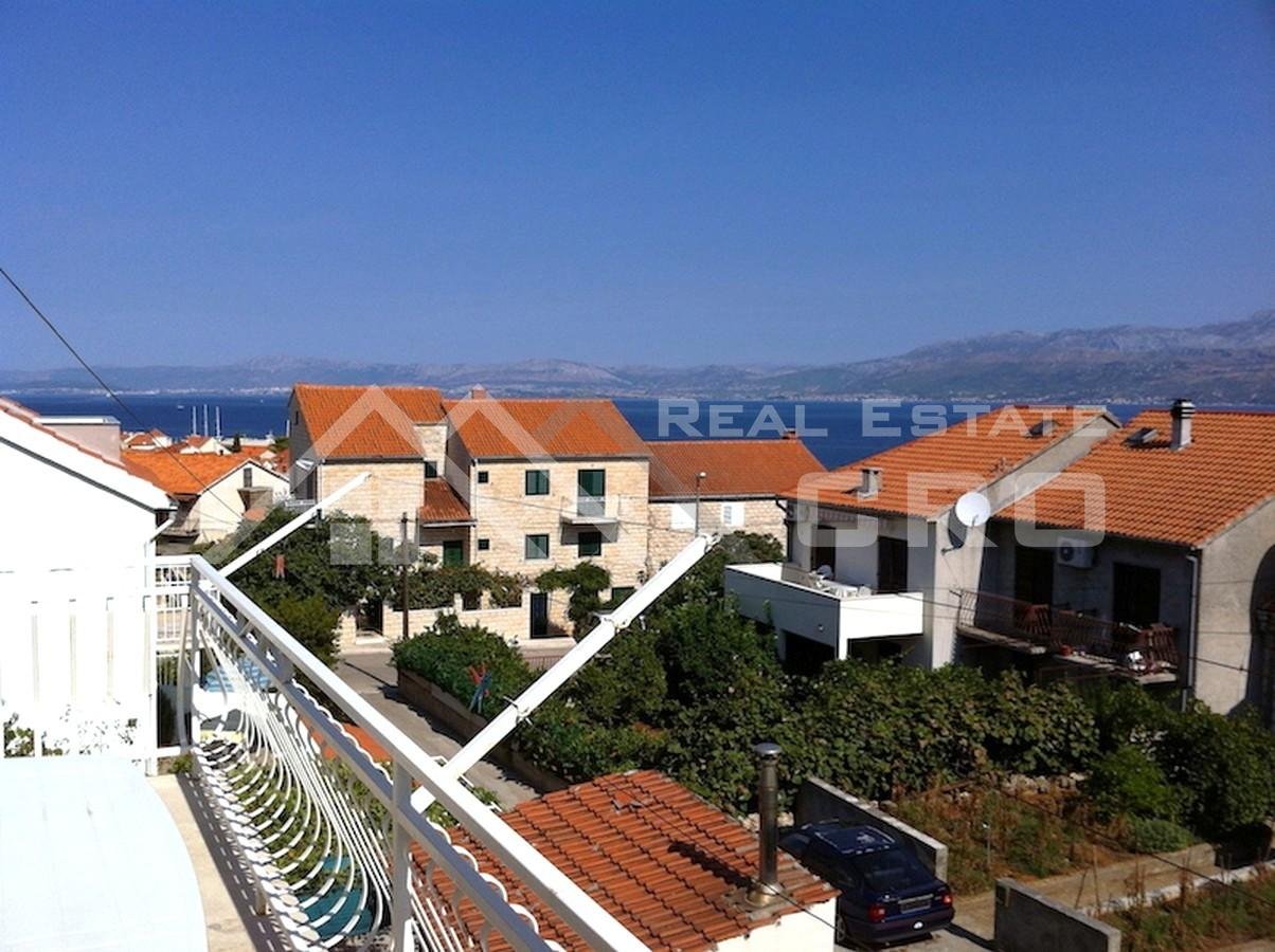 The house is situated on a plot of approx. 640 m2 and extends over three levels with a total area of around 266 m2, with the possibility of adding another level, for which a project has already been prepared. The property contains four furnished and fully equipped apartments. Two larger apartments feature three bedrooms and two bathrooms each, while the remaining two smaller units are arranged as a studio apartment and a one-bedroom apartment. The larger apartments on the ground floor and first floor have access to terraces and balconies with sea views. All apartments are air-conditioned and ready for use. Parking for up to six cars is provided in front of the main entrance.